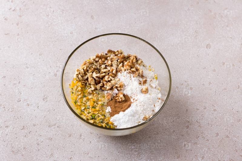 Стеклянная миска со смешанной измельченной тыквой, яйцами, сахаром, овсянкой и мукой, орехами и корицей на бежевом текстурированном фоне. Готовим вкусную домашнюю осеннюю выпечку