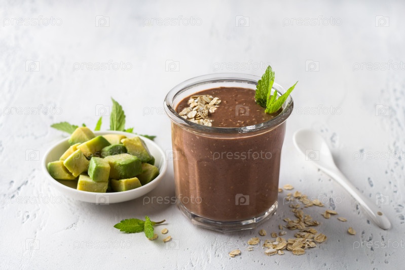 Шоколадный смузи или коктейль с замороженным авокадо и овсянкой, украшенный листьями мяты на светло-голубом столе. Веганская еда