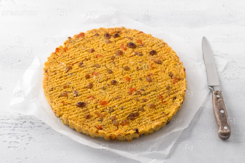 Запеканка из пшена с орехами и сухофруктами на светло-голубом фоне. Вкусное веганское блюдо