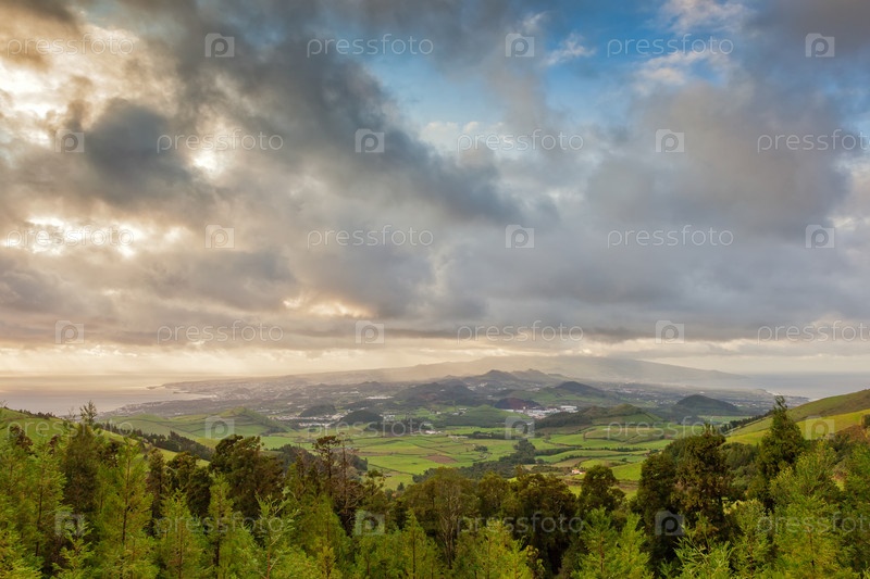 Вид с воздуха на остров Сан-Мигель под тяжелыми облаками