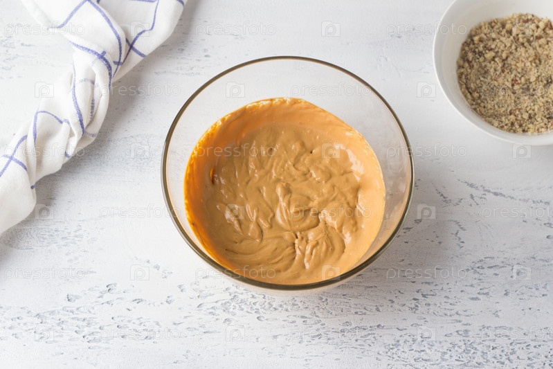 Стеклянная чаша с кремом из вареного сгущенного молока и сливочного сыра, и чаша с молотыми орехами на светло-голубом фоне, вид сверху. Готовим вкусный домашний десерт