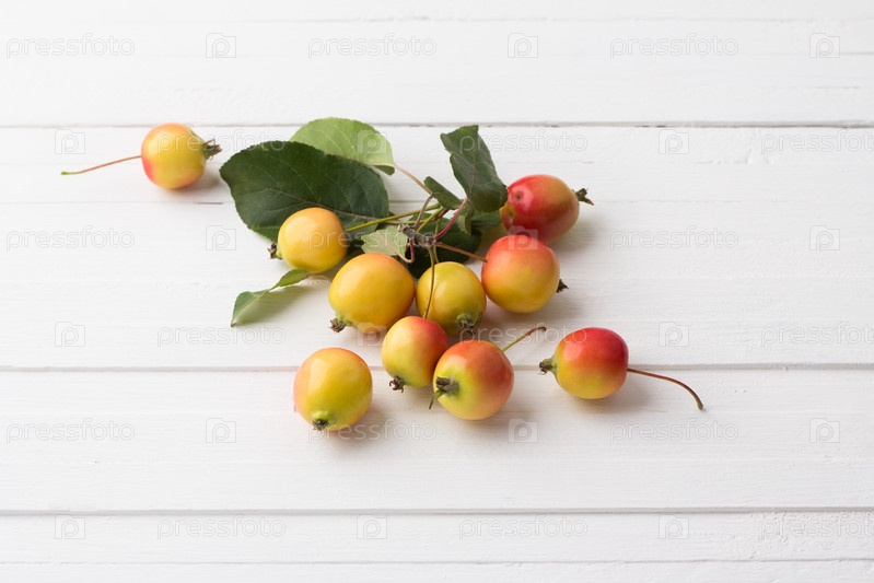 Маленькие спелые яблоки ранетки на белом деревянном фоне, вид сверху