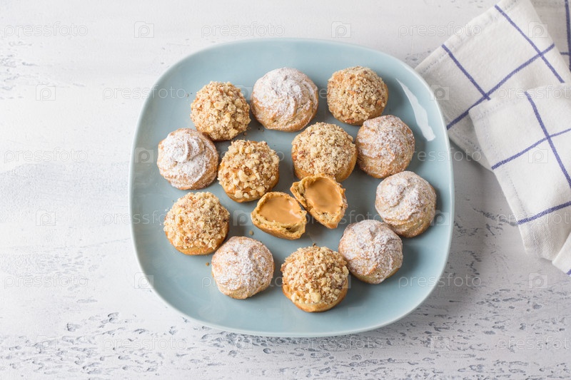 Безглютеновые овсяные профитроли с карамельным кремом из вареного сгущенного молока, посыпанные сахарной пудрой и орехами на светло-голубом фоне, вид сверху. Вкусная здоровая домашняя еда