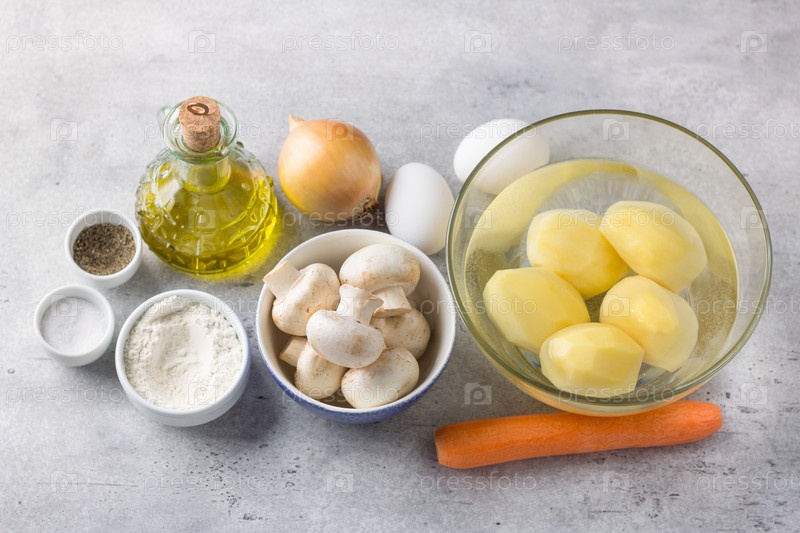 Очищенный картофель, морковь, грибы, лук, яйца, мука, оливковое масло, соль и перец для приготовления вкуснейшего веганского блюда на сером фактурном фоне