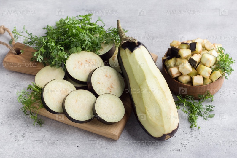 Целый баклажан с удаленной кожурой, кубики и ломтики баклажана, замоченные в соли на сером текстурированном фоне. Методы удаления горечи из баклажана