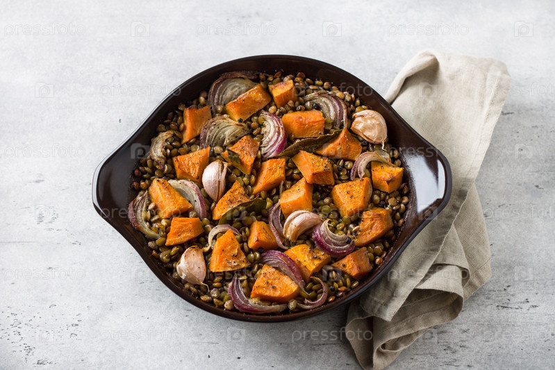 Запеченная чечевица с тыквой и луком в керамической форме на сером текстурированном фоне, вид сверху. Вкусная домашняя еда