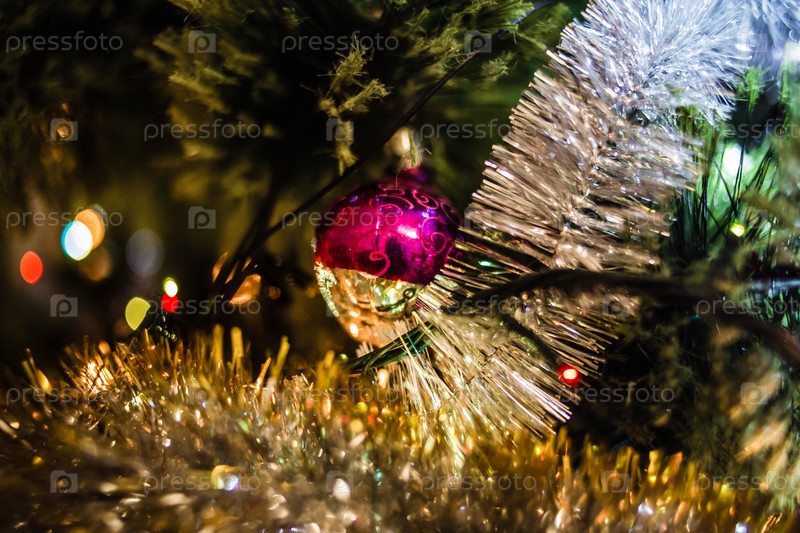 Новогоднее елочное украшение на ветке крупным планом