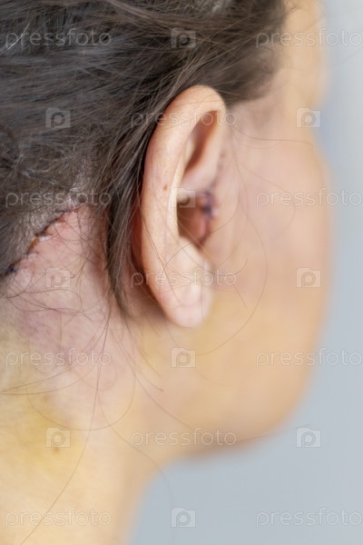 Снимок швов и шрамов на голове женщины после косметической операции. Здравоохранение