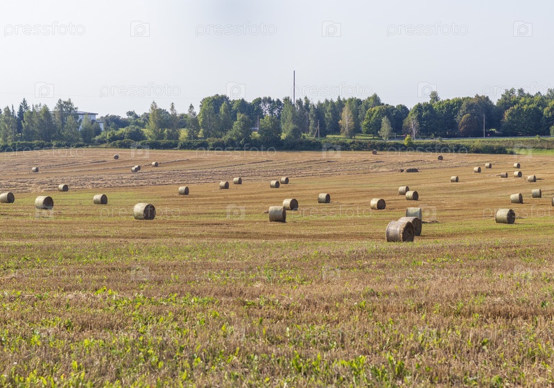 Снимок сельскохозяйственного поля после сбора урожая с круглыми стогами на нем. Сезон
