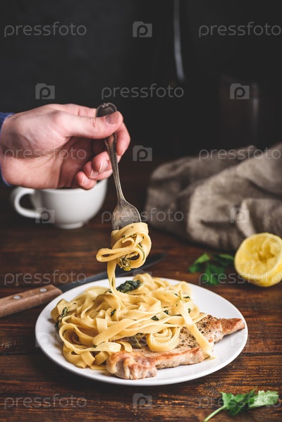 Стейк из свиной отбивной с тальятелле и каперсами