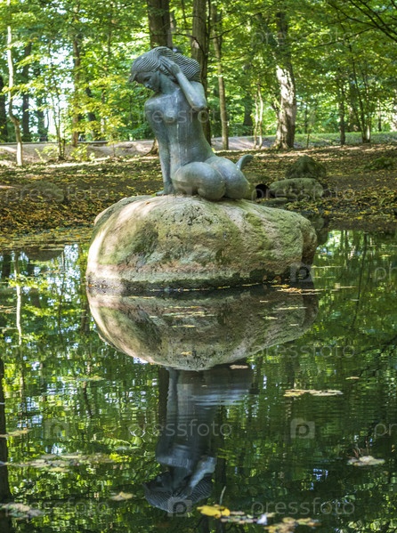 Снимок аллеи в парке. Статуя русалки в пруду. На открытом воздухе