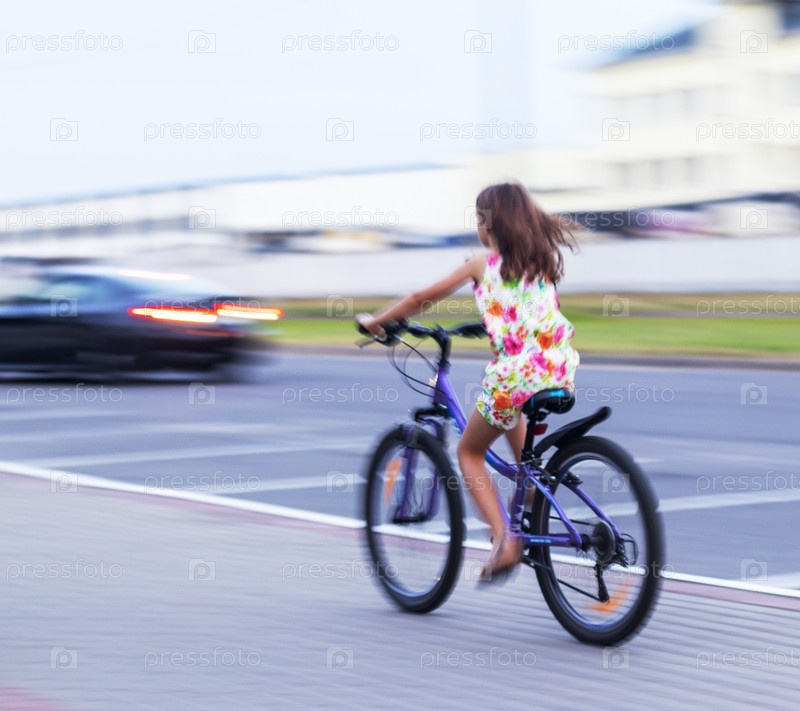 Панорамный снимок девушки на велосипеде. Город