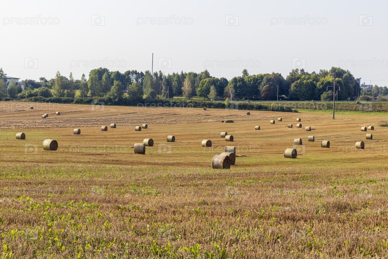 Снимок сельскохозяйственного поля после сбора урожая с круглыми стогами на нем. Природа
