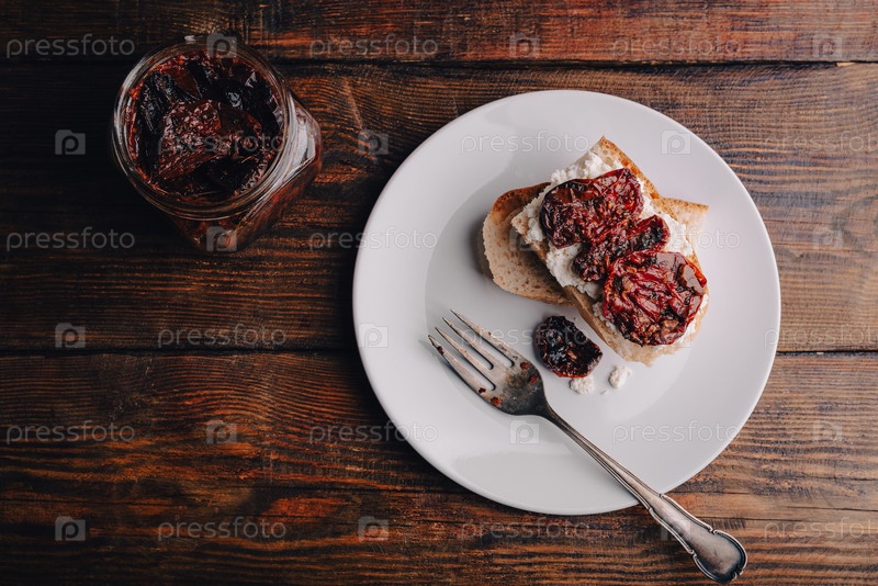 Тосты с творогом и вялеными томатами на деревянном столе