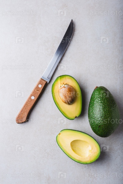 Целые и разрезанные пополам авокадо с ножом на светлом фоне