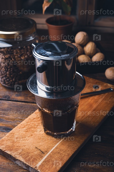 Приготовление кофе в традиционной вьетнамской кофеварке-капельнице