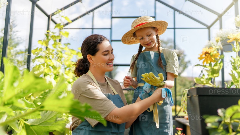 Мать и дочь занимаются садоводством в теплице