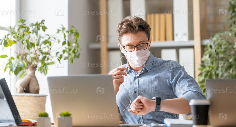 Мужчина в маске работает на ноутбуке
