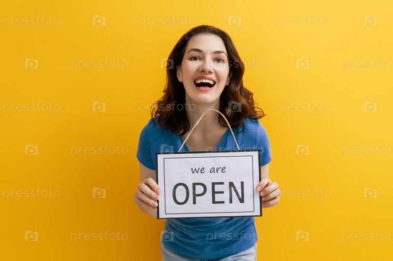 Владелец бизнеса держит табличку с объявлением об открытии