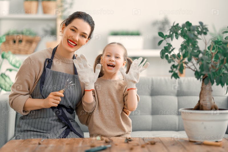Семья ухаживает за растениями