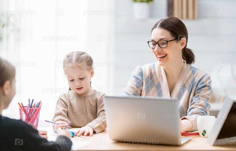 Мать с детьми работает за компьютером