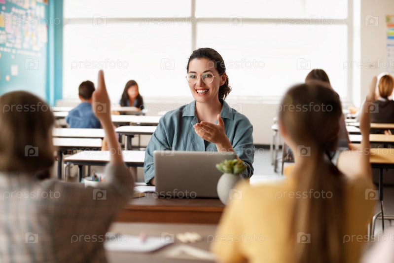 Счастливые дети и учитель в школе