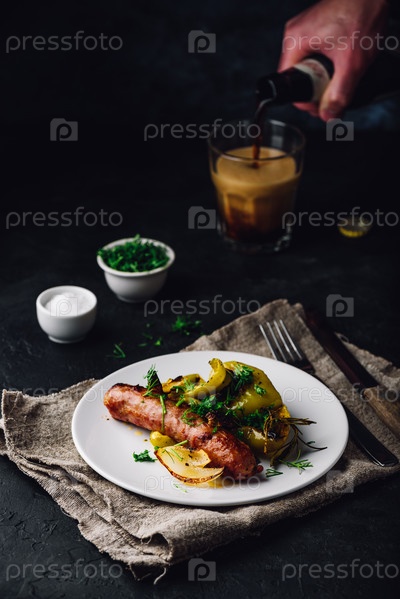 Запеченная свиная колбаса с зеленым болгарским перцем, луком и зеленью