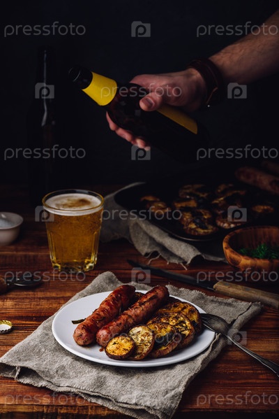 Свиные колбаски, запеченные с баклажанами, луком-пореем и травами на белой тарелке. Мужчина наливает пиво из бутылки в стакан