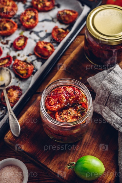 Свежеприготовленные вяленые томаты с орегано и маслом в стеклянной банке