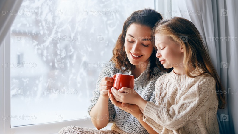Мать и дочь наслаждаются зимней природой у окна