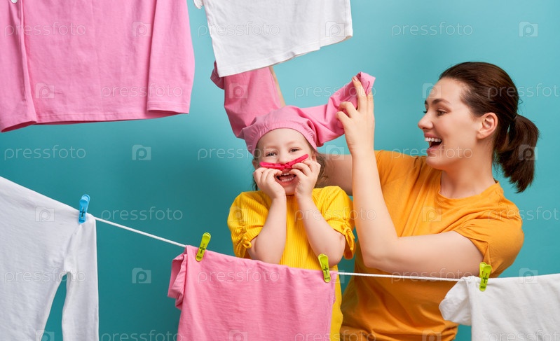 Женщина и девочка развешивают одежду на веревке