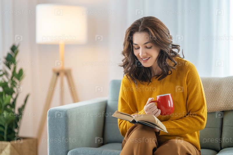 Женщина наслаждается книгой и чаем