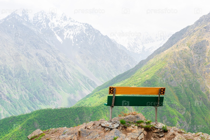 Деревянная скамейка в горах с видом на красивые живописные горы Северного Кавказа. Россия