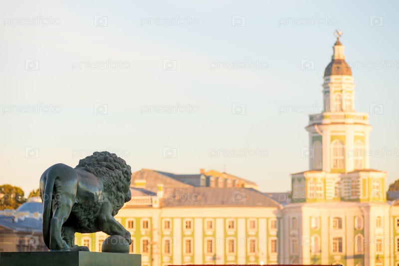 Скульптура льва на Адмиралтейской набережной в Санкт-Петербурге напротив Кунсткамеры летним вечером