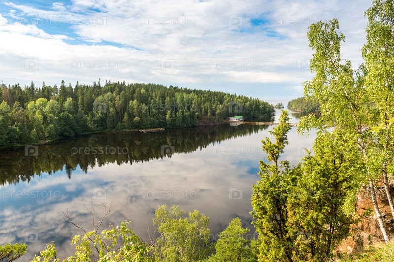 Красивое лесное озеро в России. Панорамный вид на красивый ландшафт озера