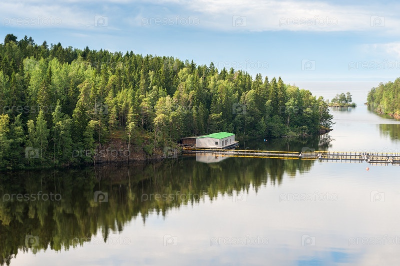 Красивое лесное озеро в России. Панорамный вид на красивый ландшафт озера
