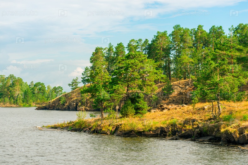 Северное Карельское озеро, дикая природа России. Лес, растущий на камнях