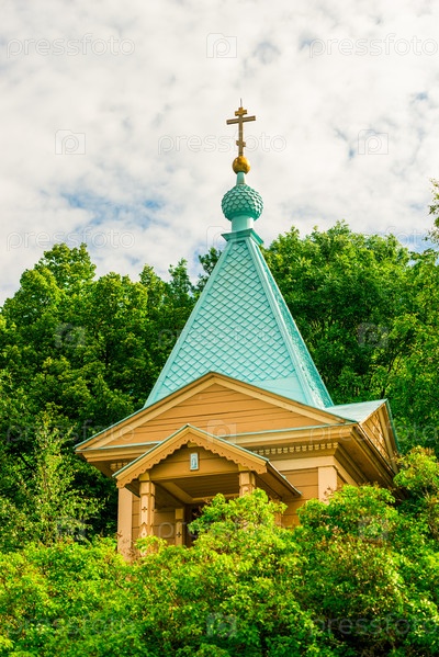 Красивая небольшая часовня на берегу озера на острове Валаам. Карелия, Россия