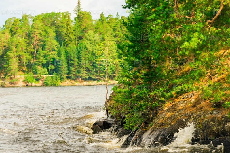 Северное Карельское озеро, дикая природа России. Лес, растущий на камнях