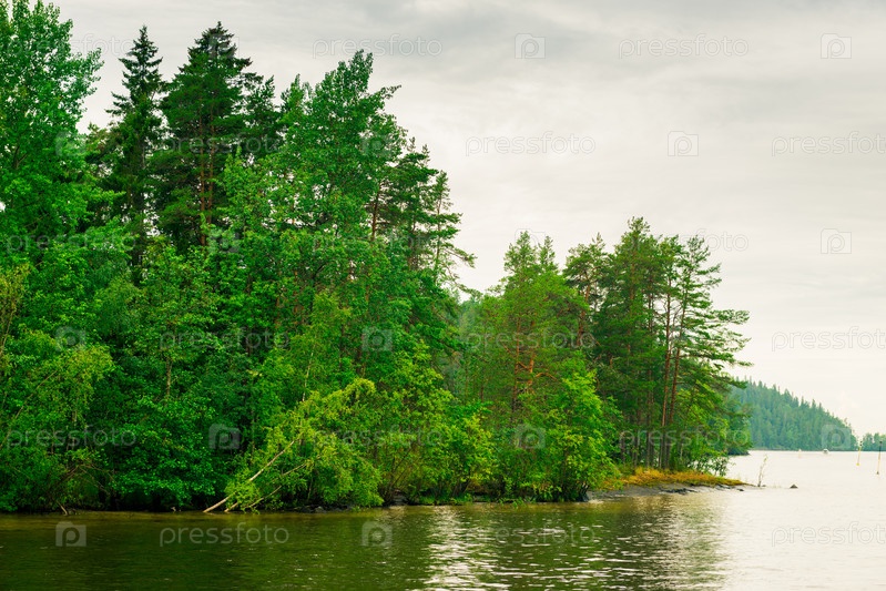 Северное Карельское озеро, дикая природа России. Лес, растущий на камнях