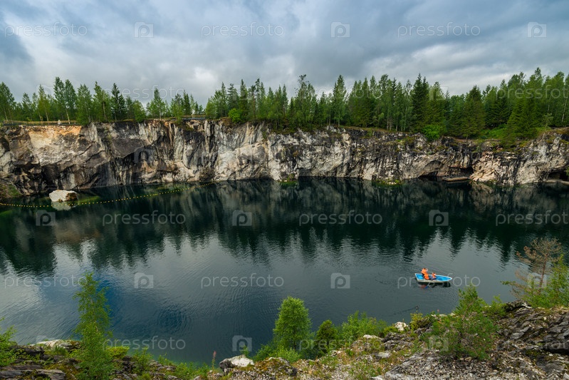 Лодки на Мраморном озере в горном парке Рускеала в Карелии, Россия