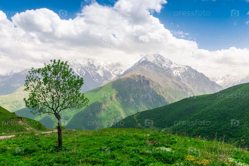 Одинокое листопадное дерево с видом на красивые живописные горы Северного Кавказа. Россия