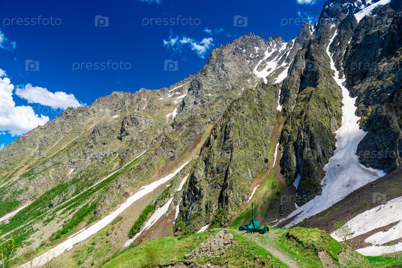 Высокие живописные зеленые горы с остатками тающего снега в горах Северного Кавказа. Россия