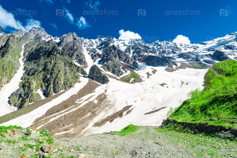Горная тропа среди снега и зеленых склонов, ведущая к скалистому заснеженному склону высокой горы. Северный Кавказ. Россия