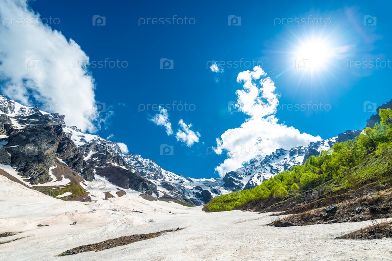 Снежный склон на фоне живописной скалистой горы. Северный Кавказ. Россия