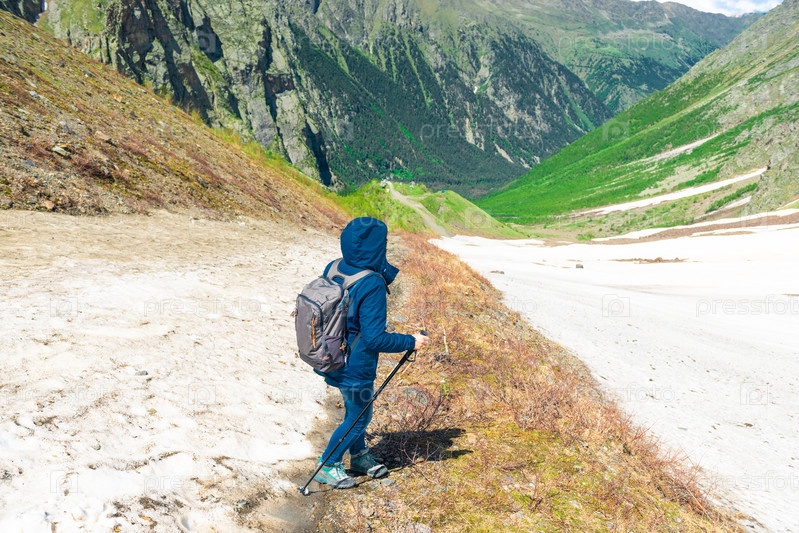 Молодая девушка-туристка на фоне живописных заснеженных гор. Северный Кавказ. Россия