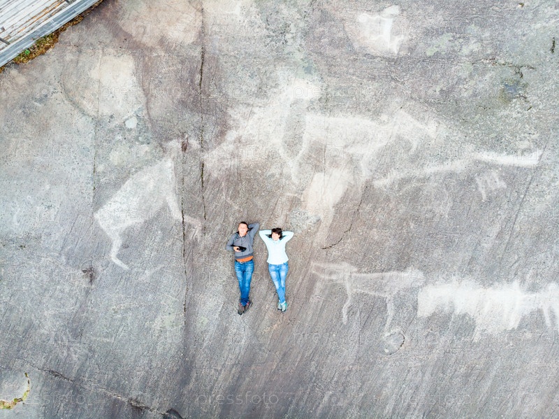 Двое молодых людей изучают примитивные петроглифы Белого моря