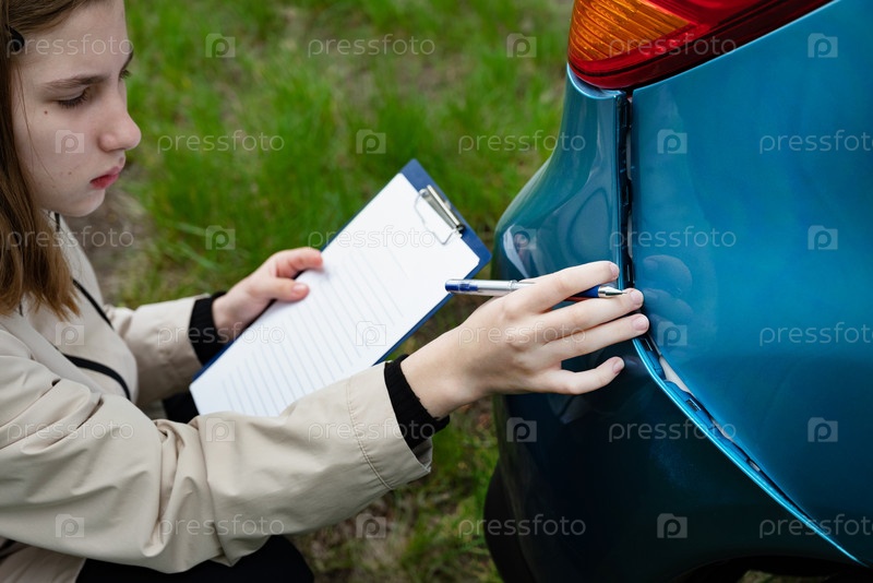 Осмотр повреждений автомобиля с помощью планшета и ручки на вмятой поверхности синего автомобиля