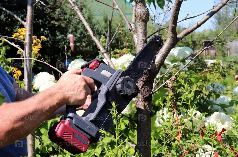 Мужчина спиливает сук на яблоне в саду летом - рука с электропилой, крупный план