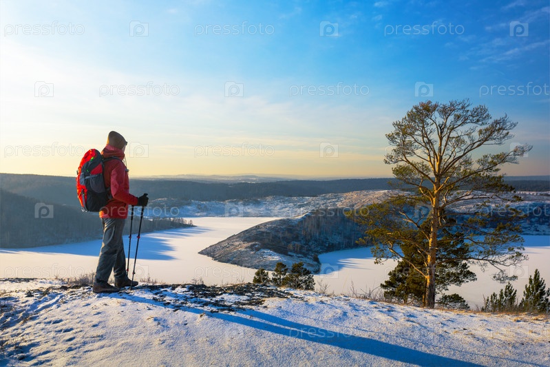 Человек-турист, идущий пешком по заснеженной зимней природе на рассвете. Время приключений зимой
